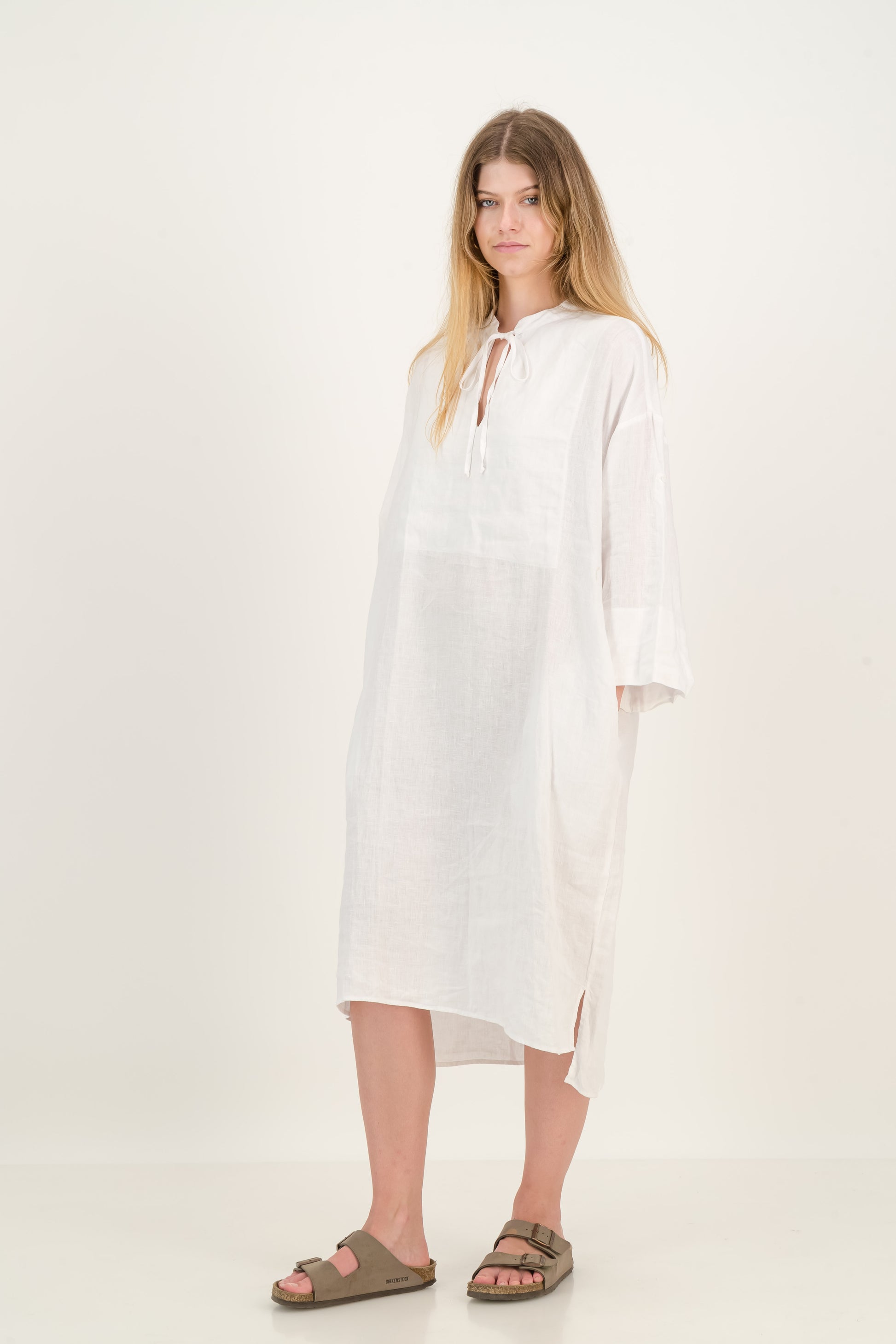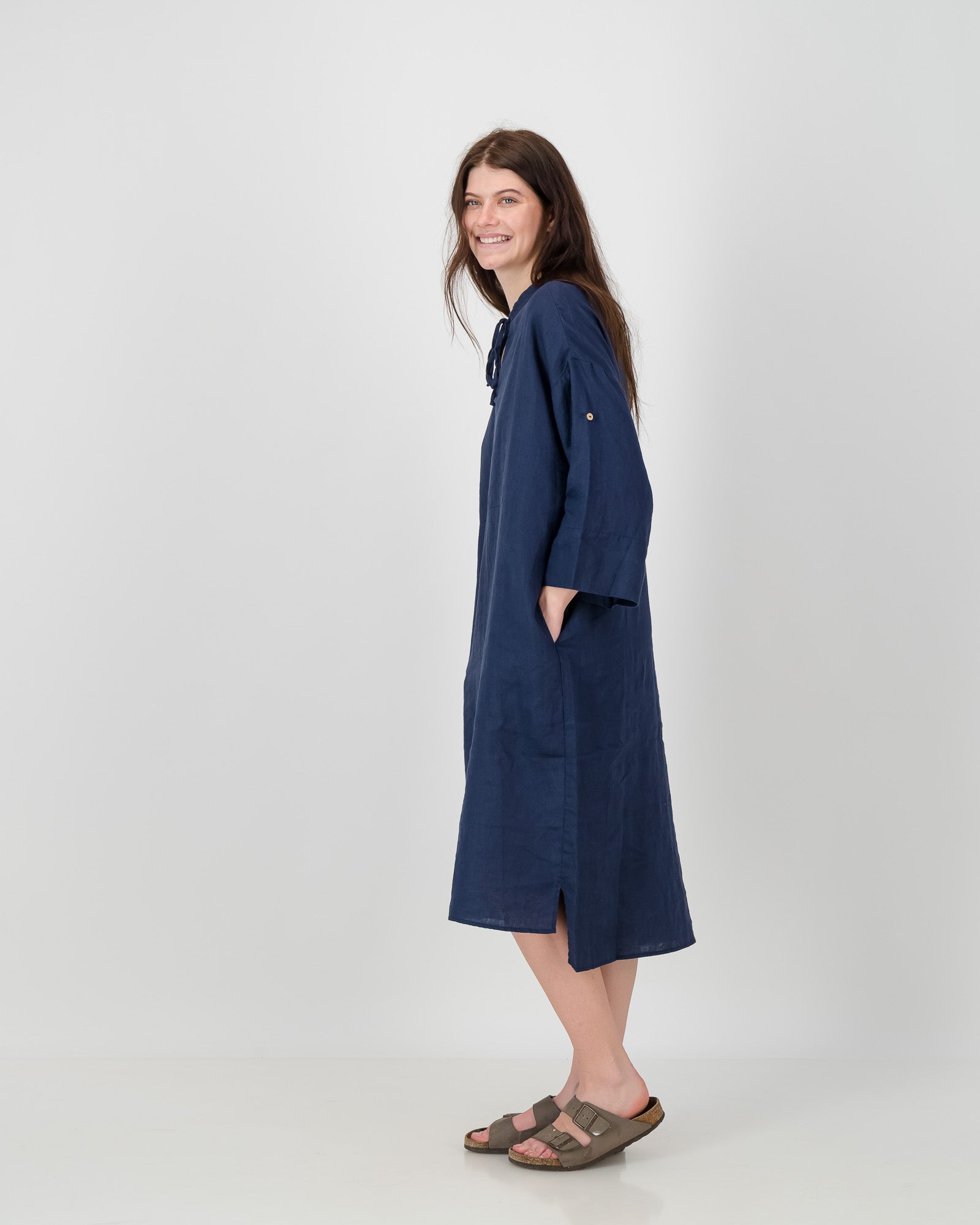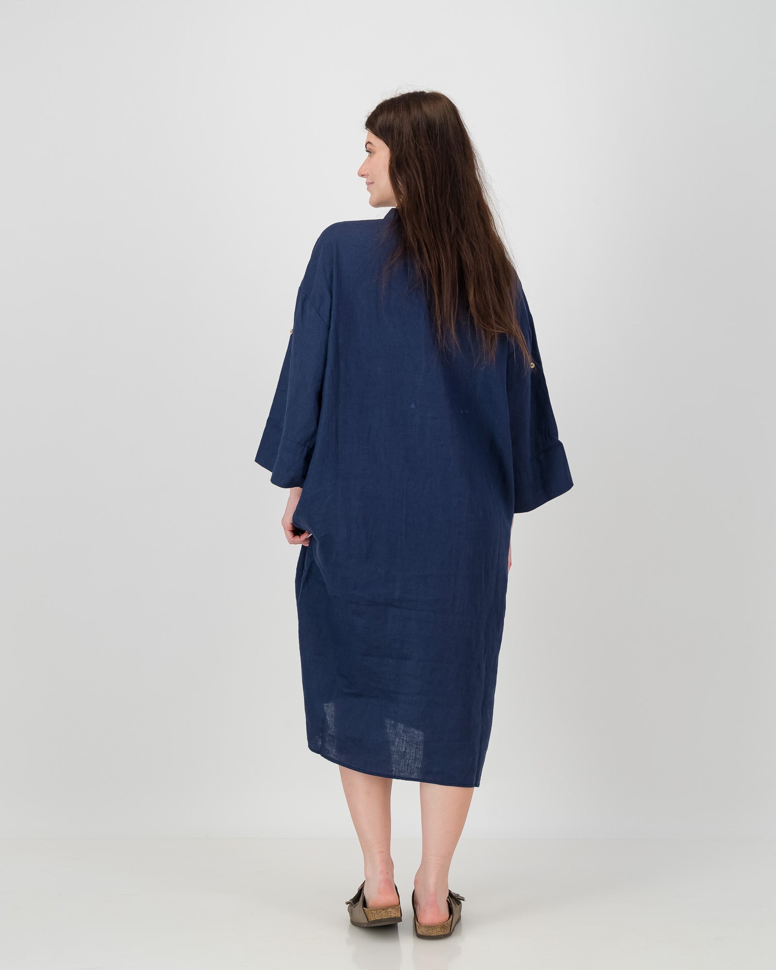 A relaxed and comfortable linen kaftan with full sleeves that can be rolled up and buttoned. Accompanied by two deep side pockets for extra comfort.
