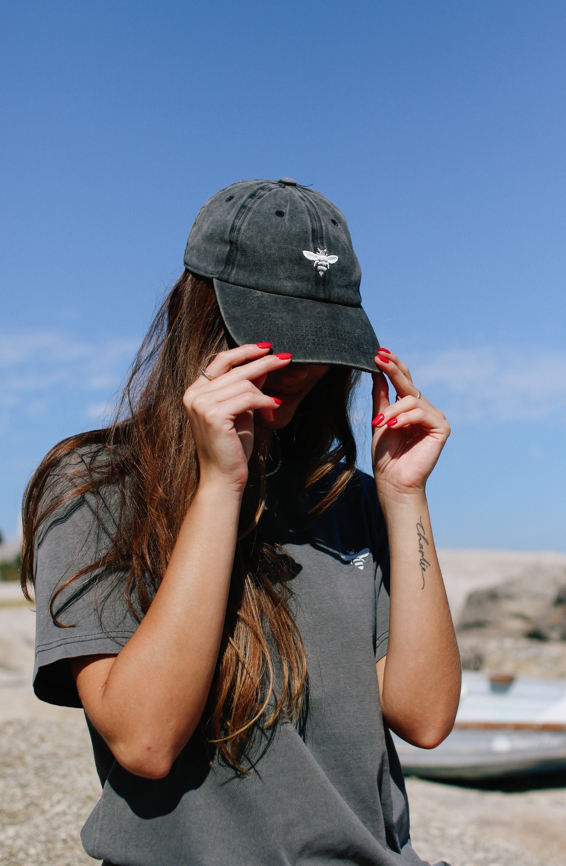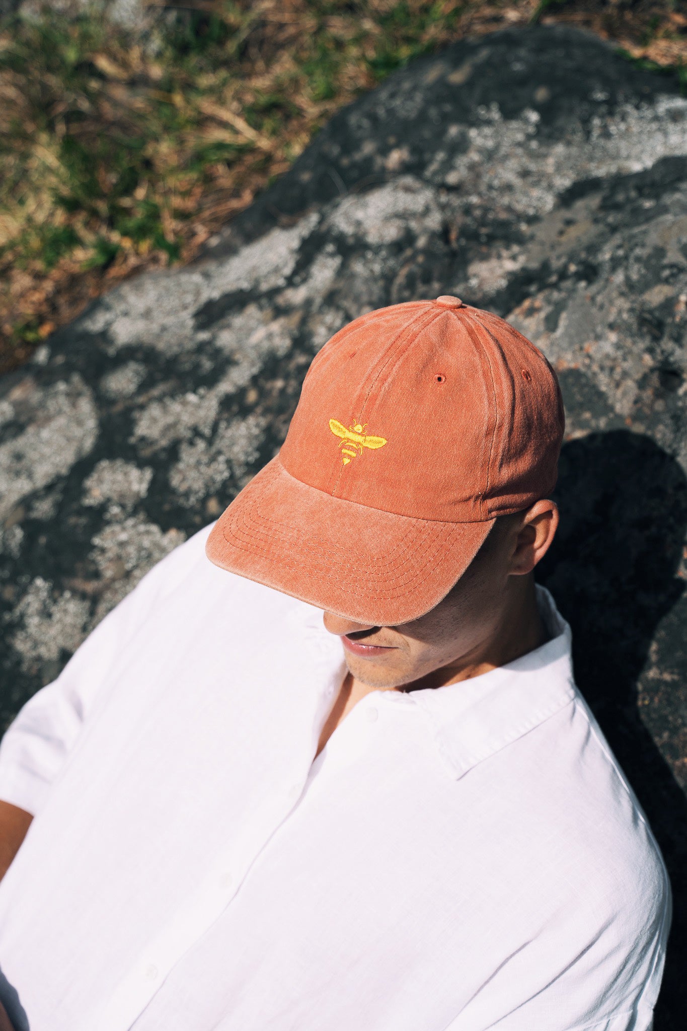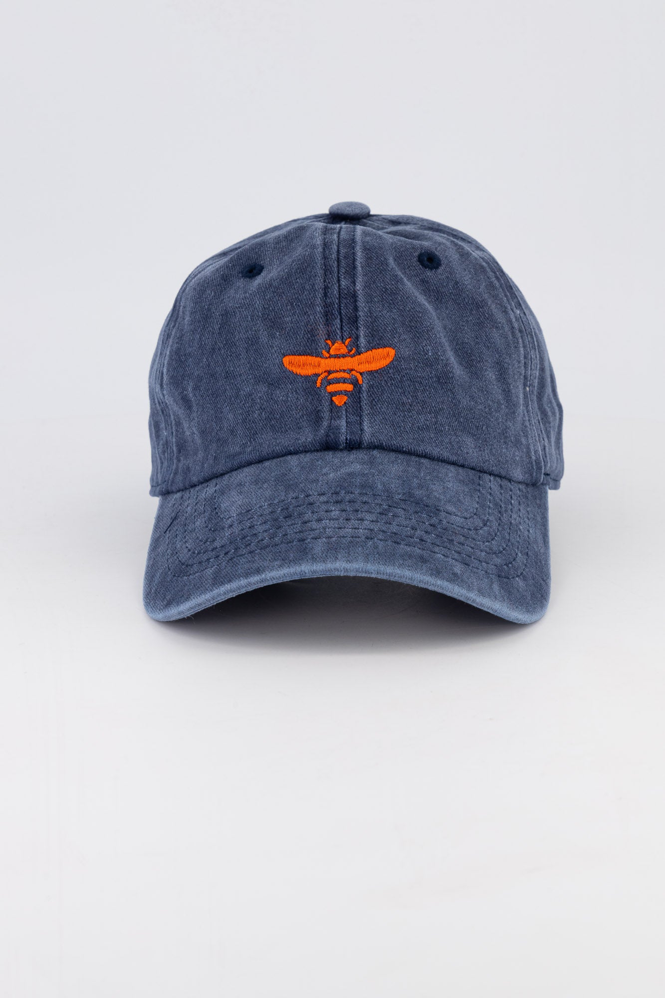 Our washed cotton twill caps are locally embroidered with our iconic bee logo.