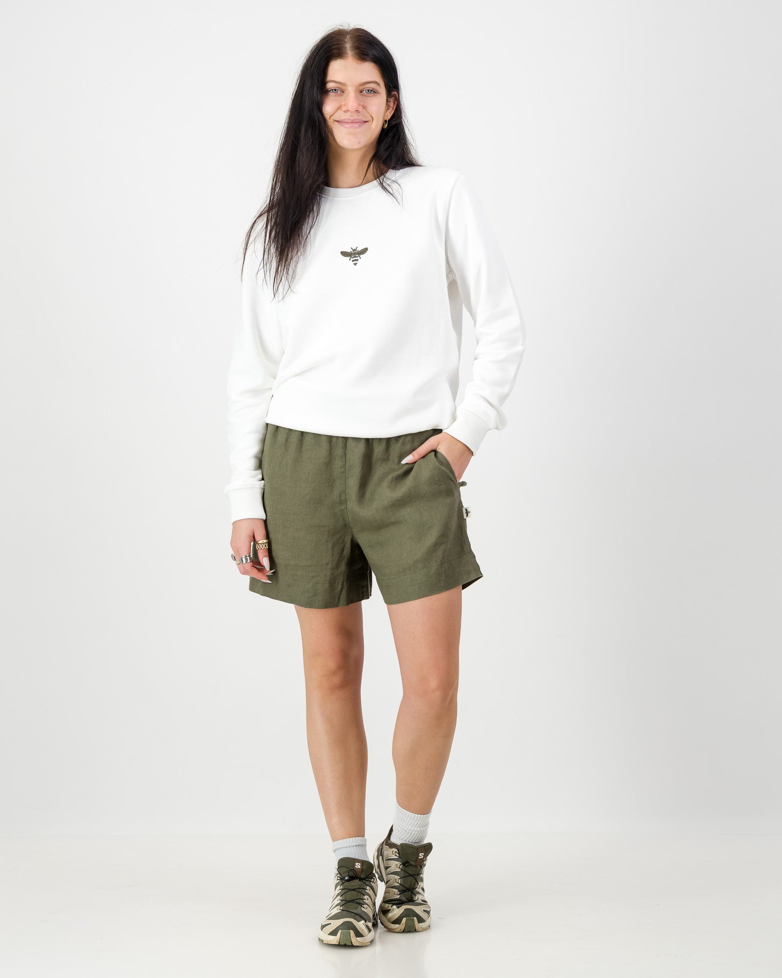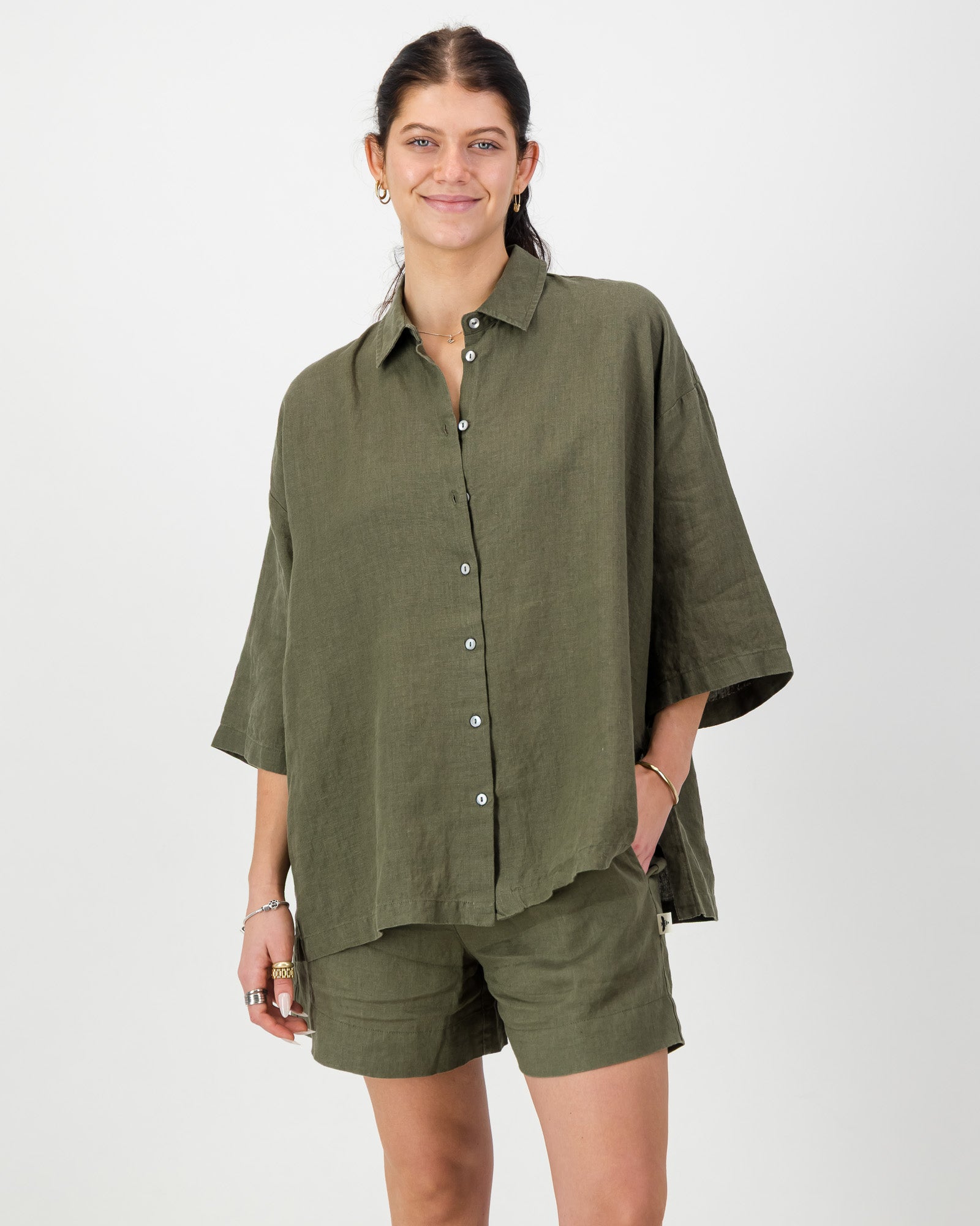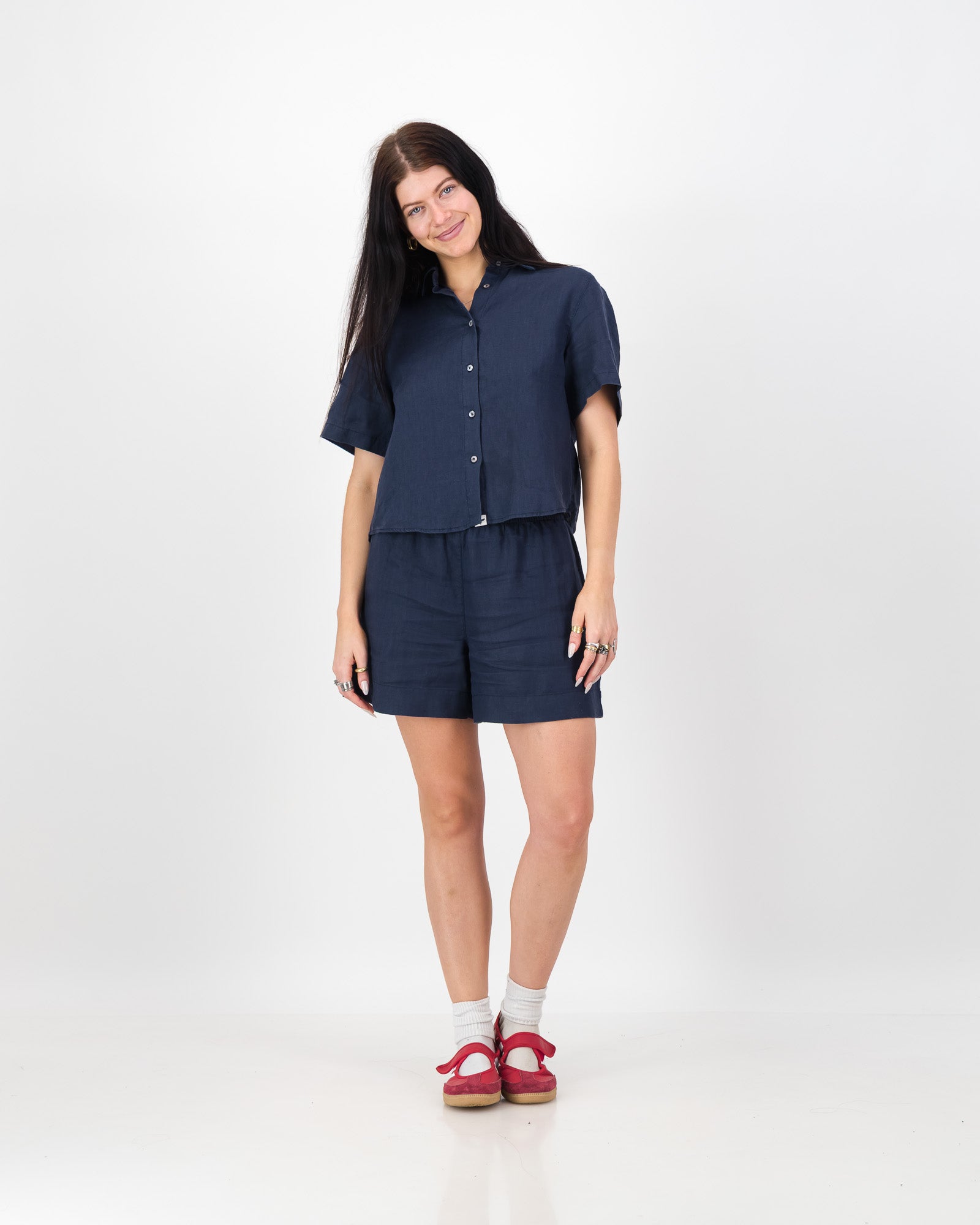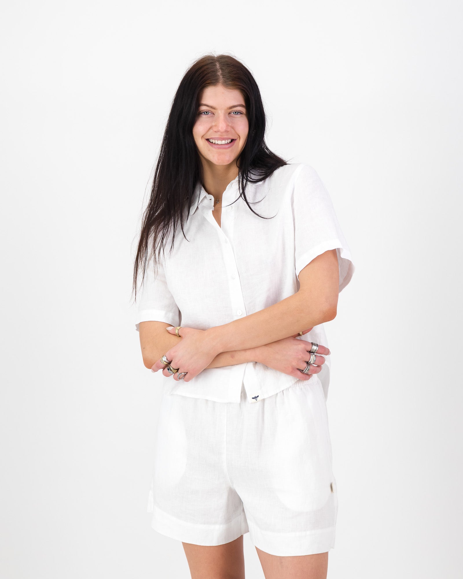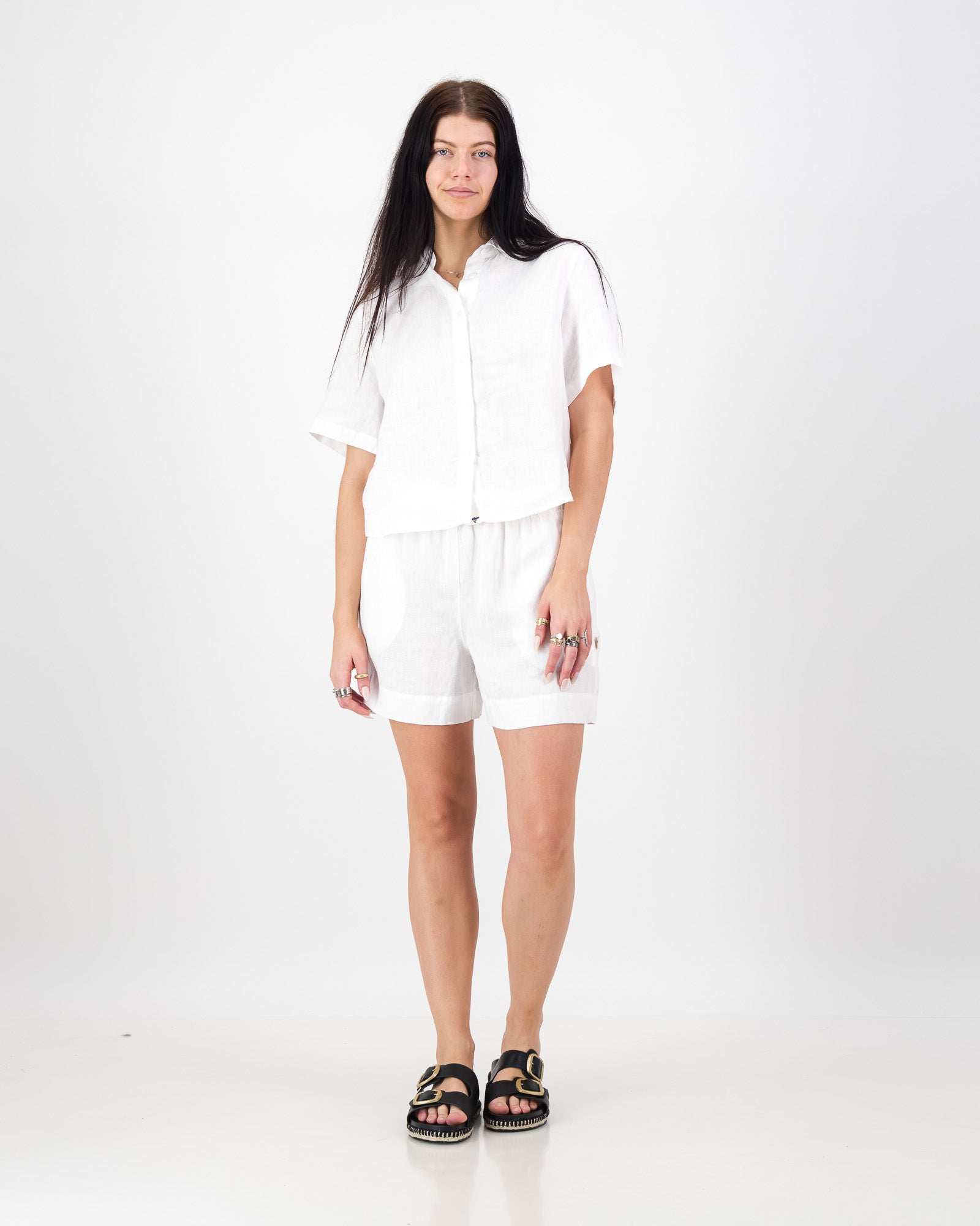 Relaxed easy to wear premium linen shorts with a wide elastic waist band of fit and comfort, shorts also have side pockets.